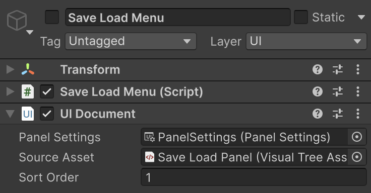 Add a UIDocument component to the UI / Save Load Menu game object and configure it like the New Map menu, but with the appropriate document asset. Then remove the components for the old UI and the child objects, and revert the Transform component, like we did before. We again have to remove the components in the correct order to avoid complaints about the required components.